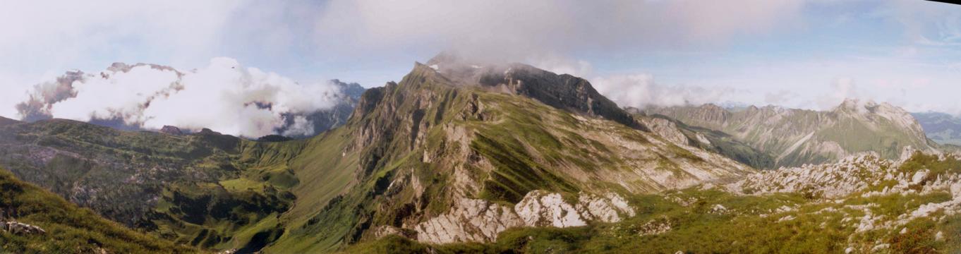 Nach der grandiosen Aussicht über den Kanton Zürich und einer Mittagspause unter den Schafen machen wir uns an den Aufstieg auf den Mutteristock, der laut den beiden Autoren "ab und zu den Einsatz der Hände" nötig macht... mit 20kg am Rücken und unter Beschuss Steinbrocken werfender Steinböcke kein leichtes Unterfangen! Aber schliesslich erreichen wir doch den enttäuschend bevölkerten Gipfel, leider mitten in der Wolke.